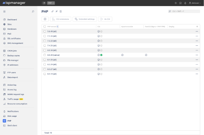 Jokaiselle sivustolle eri PHP (5.x:stä 8.x:ään), Python ja Node.js -versiot samanaikaisesti.